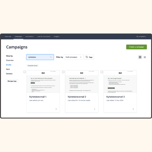 I Signaturmallen ingår tre stycken nyhetsbrevsmallar som ligger i en färdig automatiserad kundresa - en perfekt inledning på hur du kan arbeta vidare med automation i e-postmarknadsföring.