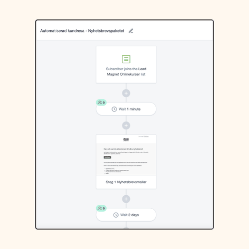 Bild 4: Färdig automatiserad kundresa som startar direkt när potentiell kund skickat in kontaktauppgifter via din Lead Magnet som finns i Signaturmallen